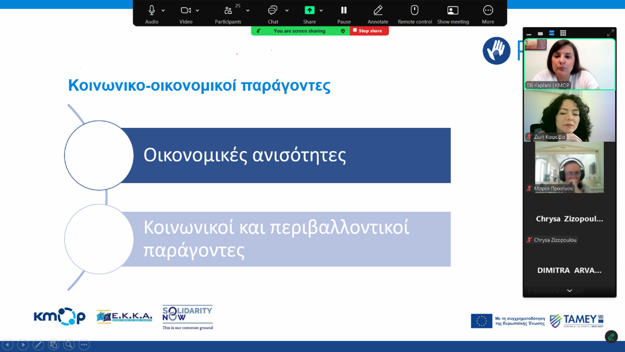 Στις 08 Ιουλίου 2025 το ΚΜΟΠ μαζί με το ΕΚΚΑ-Εθνικό Κέντρο Κοινωνικής Αλληλεγγύης, στο πλαίσιο της πρωτοβουλίας «PROCAP – Προστασία θυμάτων εμπορίας ανθρώπων, ανάπτυξη ικανοτήτων και υποστήριξη σε βασικούς κοινωνικούς εταίρους» διοργάνωσαν μια διαδικτυακή εκπαιδευτική ημερίδα, στην οποία έλαβαν μέρος επαγγελματίες από διάφορους κλάδους εργασίας προκειμένου να πληροφορηθούν πάνω στο ζήτημα της εμπορίας ανθρώπων. Επρόκειτο για μια ημερίδα στην οποία συμμετείχαν 25 επαγγελματίες, αποκτώντας γνώσεις και δεξιότητες σχετικά με τον εντοπισμό και την παραπομπή πιθανών θυμάτων εμπορίας ανθρώπων. Αξίζει να επισημανθεί ότι εξέταση περιπτωσιολογικών μελετών από τους/τις συμμετέχοντες/ουσες ενίσχυσε την κατανόηση για το φαινόμενο αλλά και την ετοιμότητα τους να ανταποκριθούν αποτελεσματικά σε περιστατικά εμπορίας, ο καθένας στο πεδίο του.